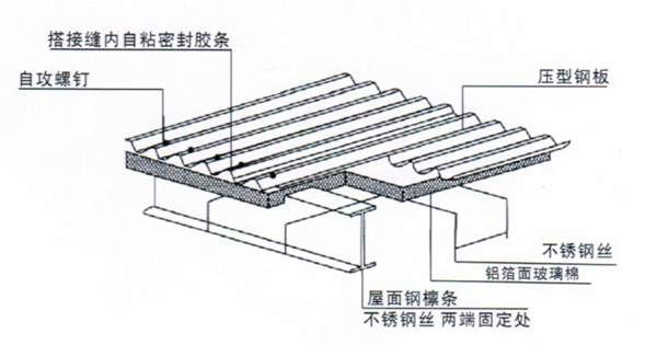 掛網(wǎng)式玻璃棉夾芯屋面板構(gòu)成玻璃絲綿夾芯板室上下兩層彩色壓型板通過龍骨和玻璃絲綿組合而成。