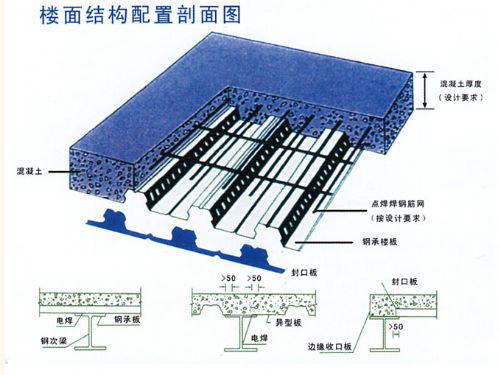 3、組合板的厚度不應(yīng)小于90mm;壓型鋼板頂面以上的混凈土厚度不應(yīng)小于50mm。